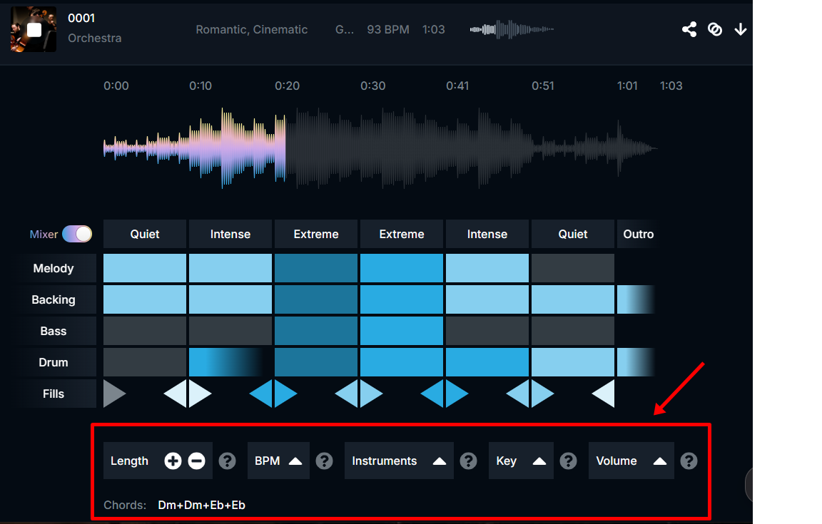 이 화면은 Soundraw의 음악 구조를 편집할 수 있는 "Mixer" 메뉴입니다. 여기서 사용자는 음악의 각 구간(intro, verse, chorus 등)과 악기별로 세부 조정을 할 수 있어요. 하나씩 설명드릴게요.
