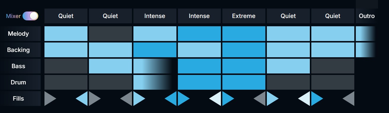 - 밝은 파란색: 그 악기 트랙이 해당 구간에서 활성화되어 있고 소리의 강도도 강한 편입니다.