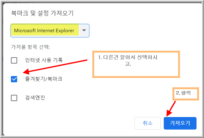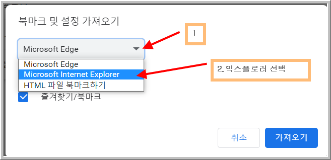 그중에 '북마크 및 설정 가져오기..' 얘를 클릭해주세요~!