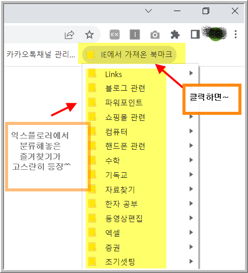 아래로 쭉~ 인터넷익스플로러에 있던 즐겨찾기가 등장합니다.