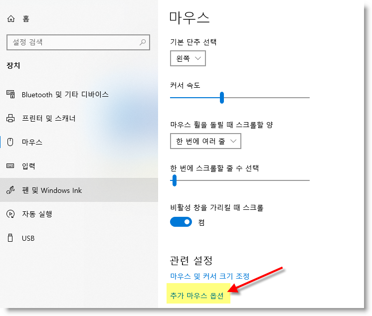 그리고 오른쪽 하단의 '추가 마우스 옵션' 클릭 합니다