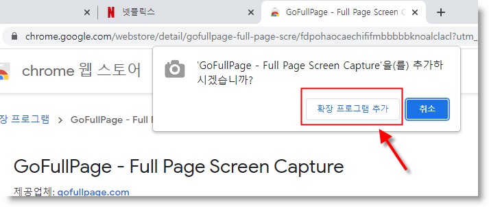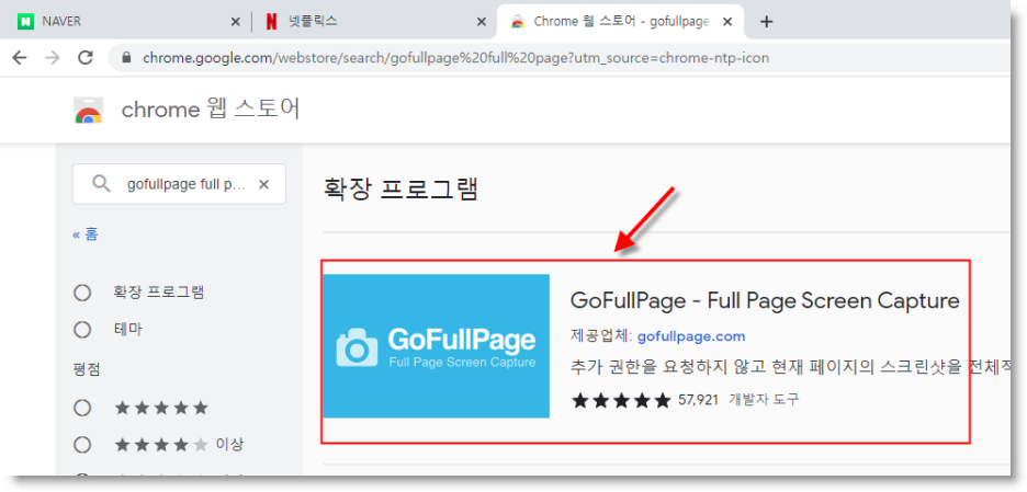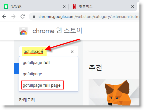 클릭하여 웹스토어 들어간 후, 왼쪽 상단의 검색란에 'gofullpage' 을 써서 검색합니다.