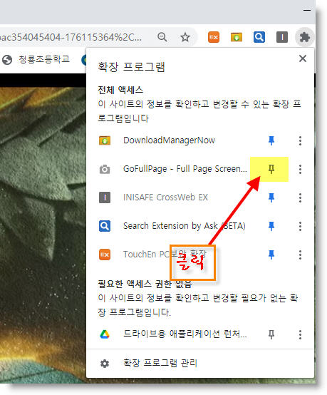 '확장프로그램'중, 우리가 다운받은 캡쳐프로그램을 크롬 브라우저에서 직관적으로 볼 수 있도록 나타내야 합니다.