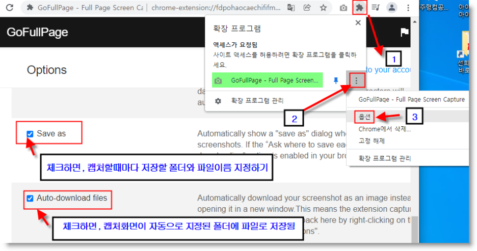 확장프로그램아이콘 - 캡쳐프로그램옆 점3개 - 옵션 선택