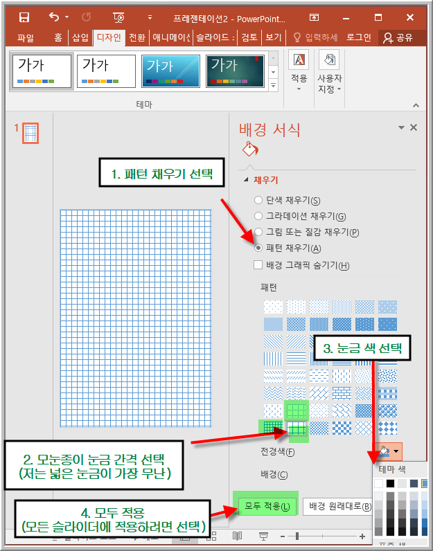 아래 그림처럼 모눈종이 선 색깔(전경색)을 원하시는 색으로 선택하시고 (저는 연습장으로 사용할꺼라 연한 회색),