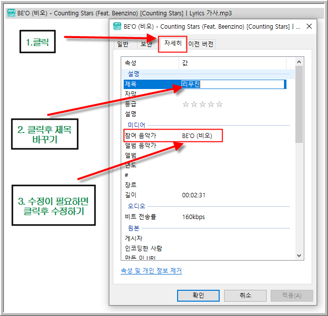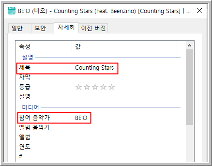 속성탭에서 제목과 음악가 이름을 지정하지 않고 나와서