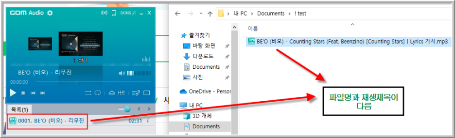 아래 이미지 처럼 곰오디오에 나오는 재생 제목이 바뀌었네요.