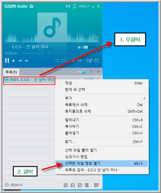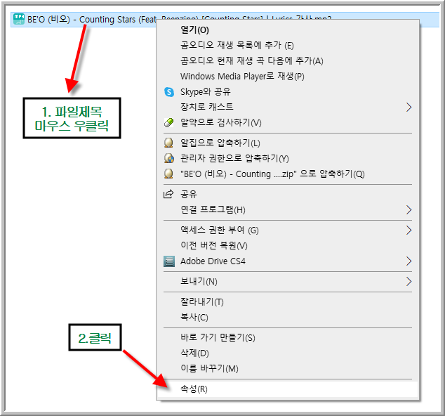 그리고 노래제목을 수정하려고 하는 음악파일을 마우스 우클릭합니다.