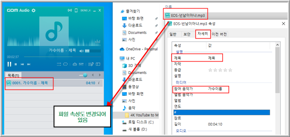 아래 이미지처럼 수정한대로 노래제목이 바뀌었습니다.