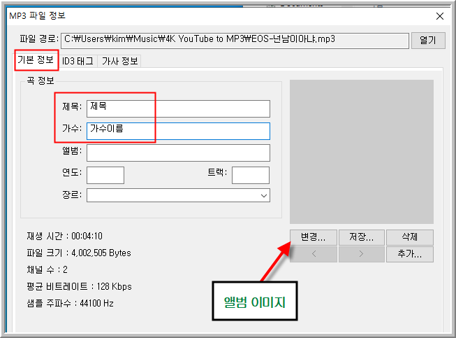 혹시 앨범이미지까지 넣고 싶으시면 아래 이미지박스 의 '변경'을 클릭 ㅎㅎ
