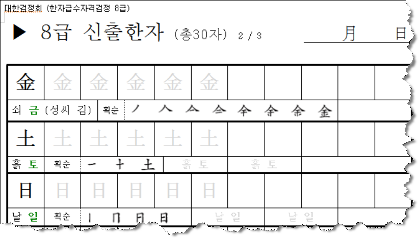 한자 한글자당, 2번째칸~5번째칸 까지는 옅은 회색으로 써 놓아, 그 위에 글자쓰기 연습을 할 수 있도록 해 놓았고,