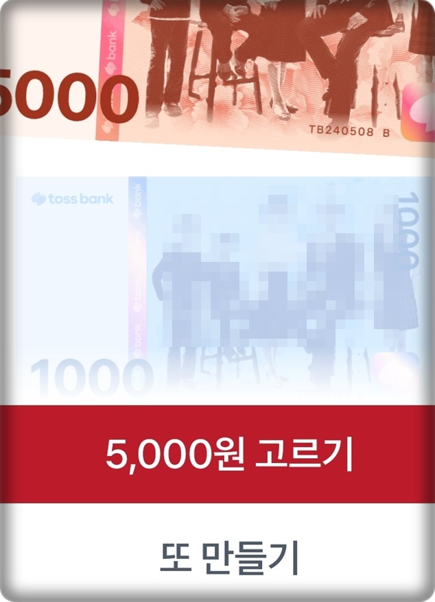 아마 토스뱅크 통장을 만드신 분은, 5,000원 짜리 외에 다른 종류의 화폐도 고를 수 있을 겁니다.