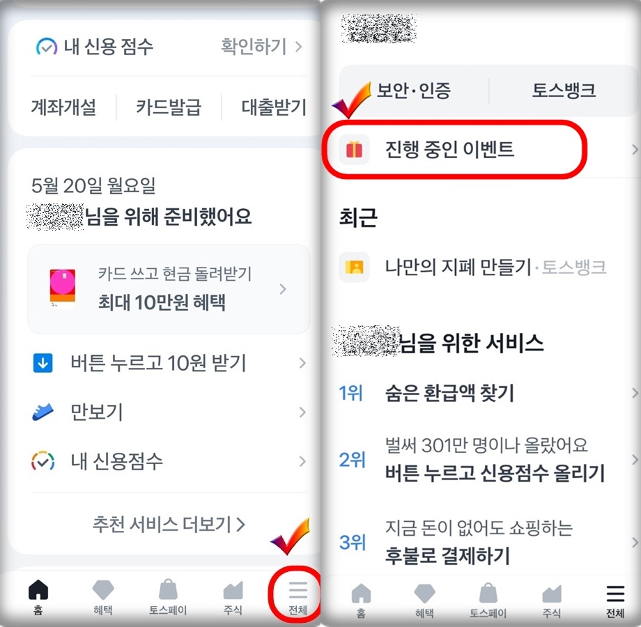 일단 토스를 열면, 메인 화면이 뜹니다.