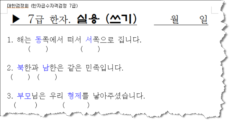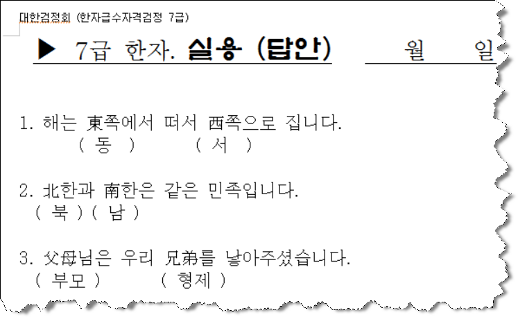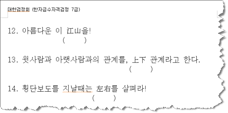 그리고 아래는, 대한검정회 한자급수자격검정 7급시험 기출문제입니다.