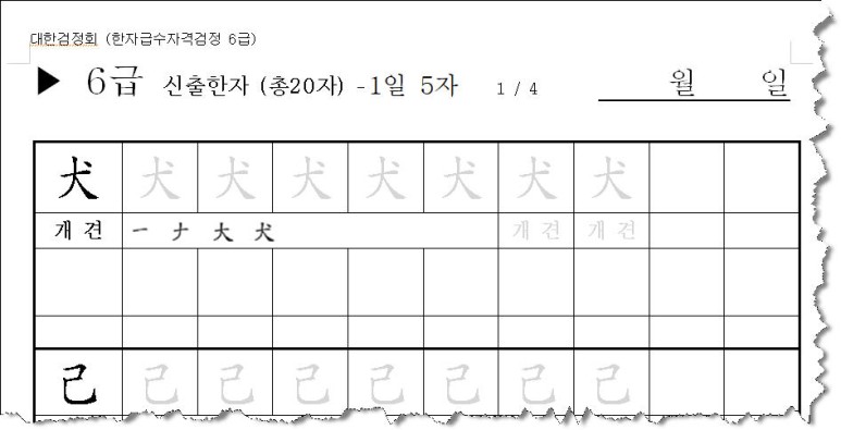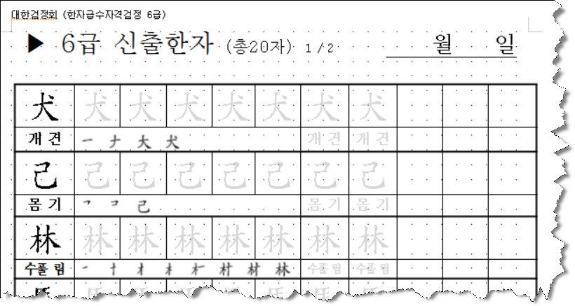 앞서 8급과 7급에서 올린 한자 따라쓰기 양식처럼, 1페이지당 10글자씩 총 2페이지로 만들었구요,