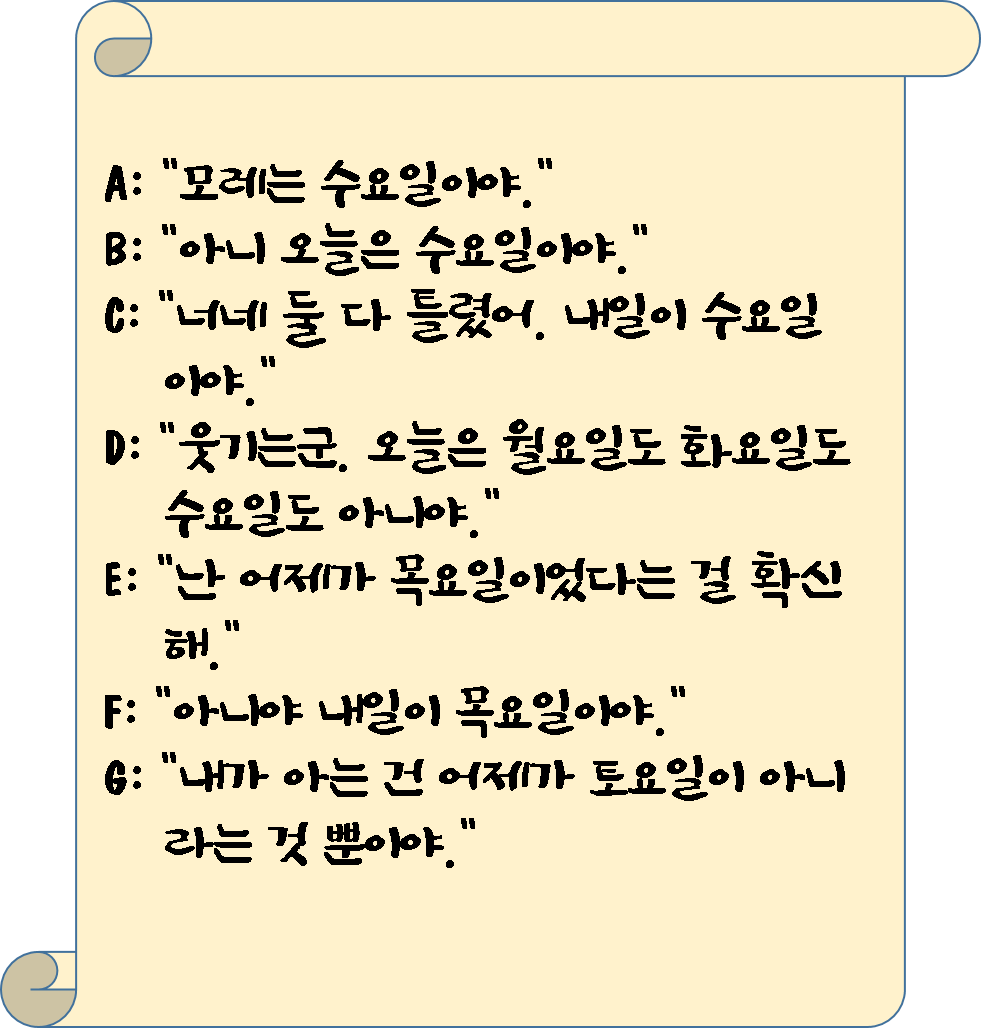 이중 딱 한사람의 말만 참이라고 한다면, 오늘은 과연 무슨 요일일까요?