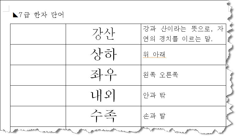 아래는 7급 한자 단어 쓰기 Test 견본입니다. 빈칸에 한자를 써야 겠지요?