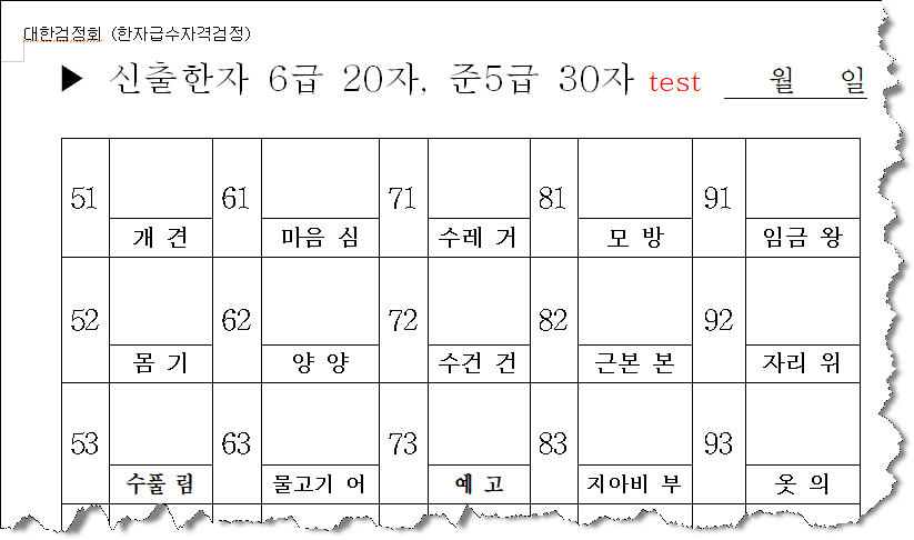 | 대한검정회 한자급수 8급~5급 한자 단어 쓰기 test (1) | 2024.06.20 |